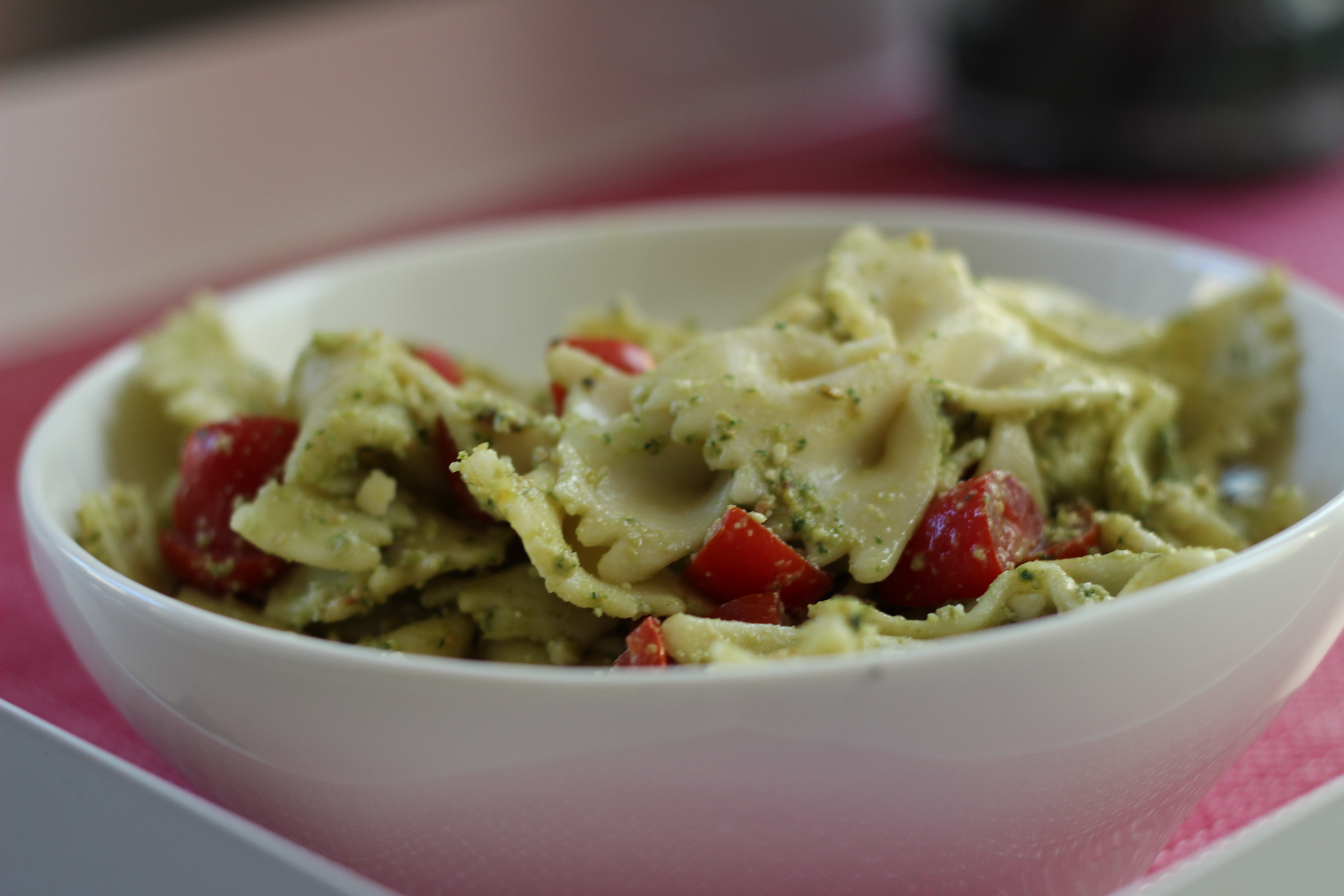 Classic basil pesto pasta salad tossed with tomatoes and fresh mozzarella.