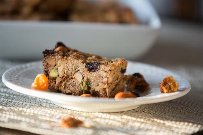 - Stir together all the dry ingredients, including the fruit and nuts. In a separate bowl, whisk together the vanilla, melted butter or oil, liquid sweeteners and water. Toss the wet ingredients (including nut butter) with the dry until the mixture is evenly crumbly. Spread in the prepared pan, pressing them in firmly to ensure they are molded to the shape of the pan.